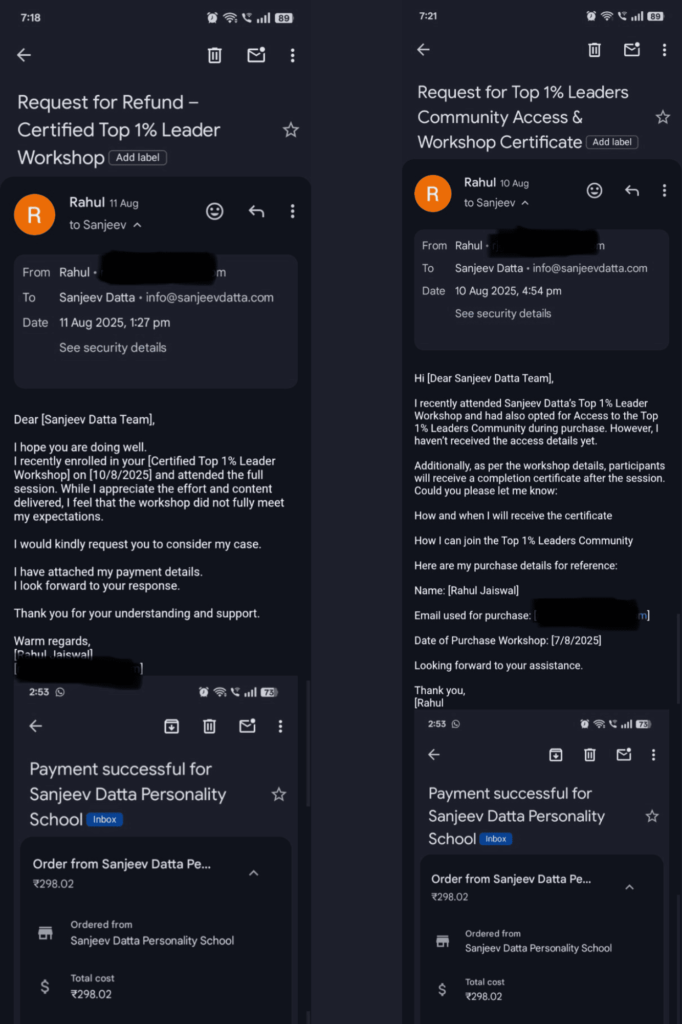 - There was a lack of support from Sanjeev Datta’s team. I emailed them multiple times but received no reply. I also sent messages to their business WhatsApp, but the responses were not proper or helpful.