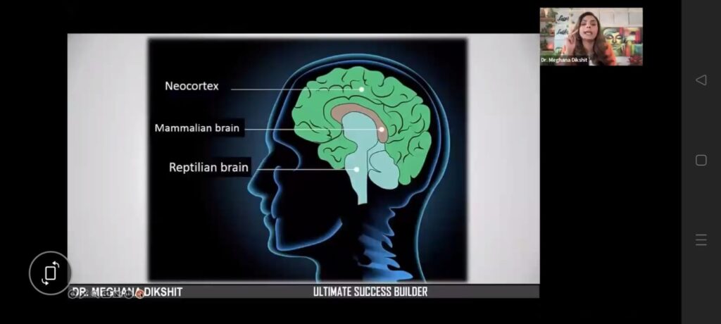 | 4. Understanding the Three Parts of the Brain The workshop then covers the three brain systems: –Neocortex Brain – The outermost layer responsible for thinking, logic, and decision-making –Mammalian Brain – Associated with emotions and feelings –Reptilian Brain – Responsible for habits, survival instincts, and automatic behavior To simplify understanding, she uses a relatable analogy: -Neocortex brain → like a child -Mammalian brain → like a mother -Reptilian brain → like a father |